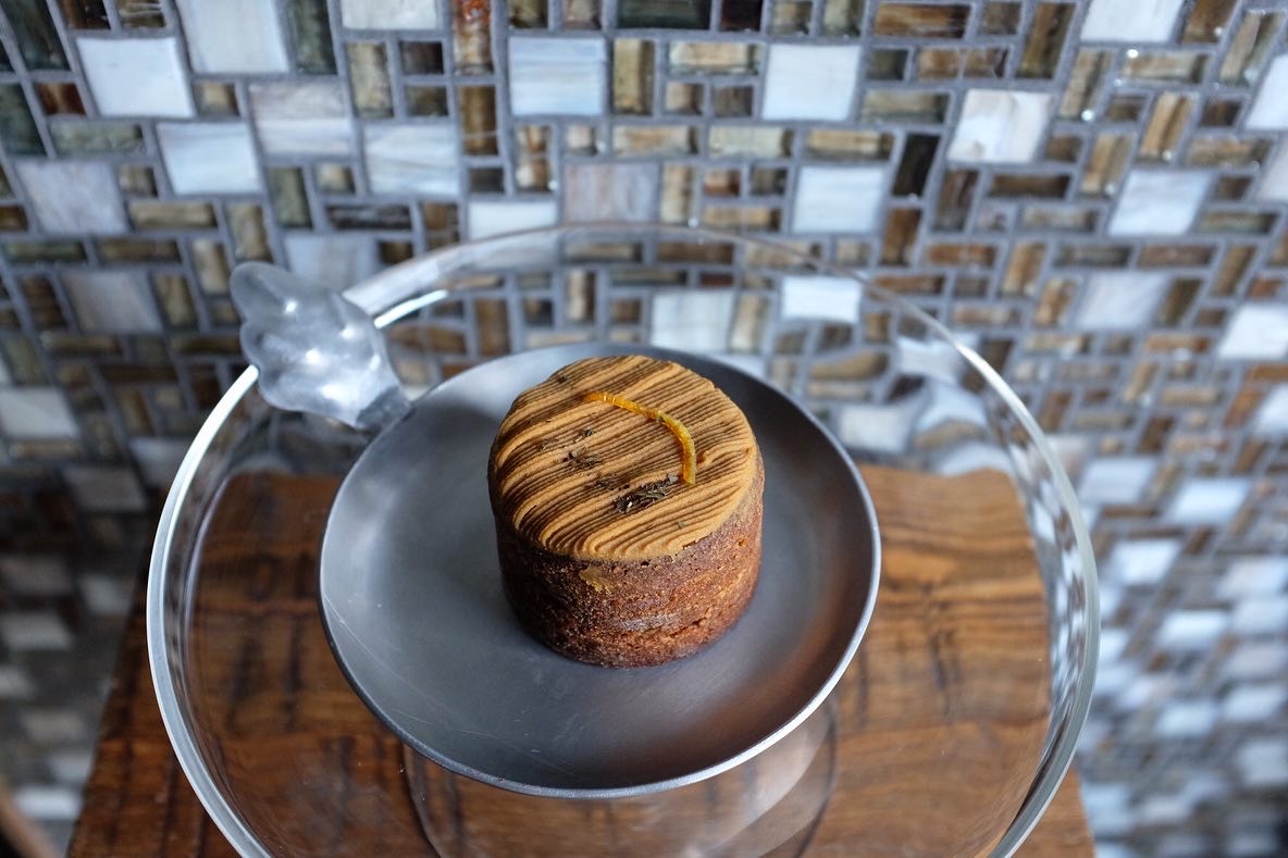 スパイスで色付けしたクランブルをあしらった限定熟タルト。